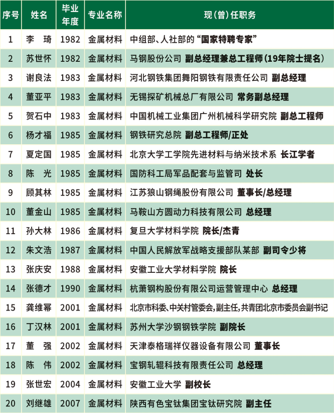 多名员工已成长为企业、高校的中高层领导,毕业生包括中国机械工业集团广州机械科学研究院副总工程师、北京市科学技术委员会副主任、钢铁研究总院结构材料研究所所长、宝武集团宝钢轧辊总经理、m88官方网站登录地址副董事长、苏州大学m88官网副经理,陕西有色宝钛集团宝钛研究院新材料实验室副主任等知名员工。