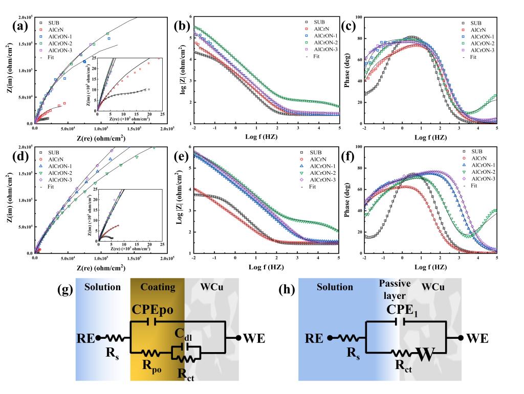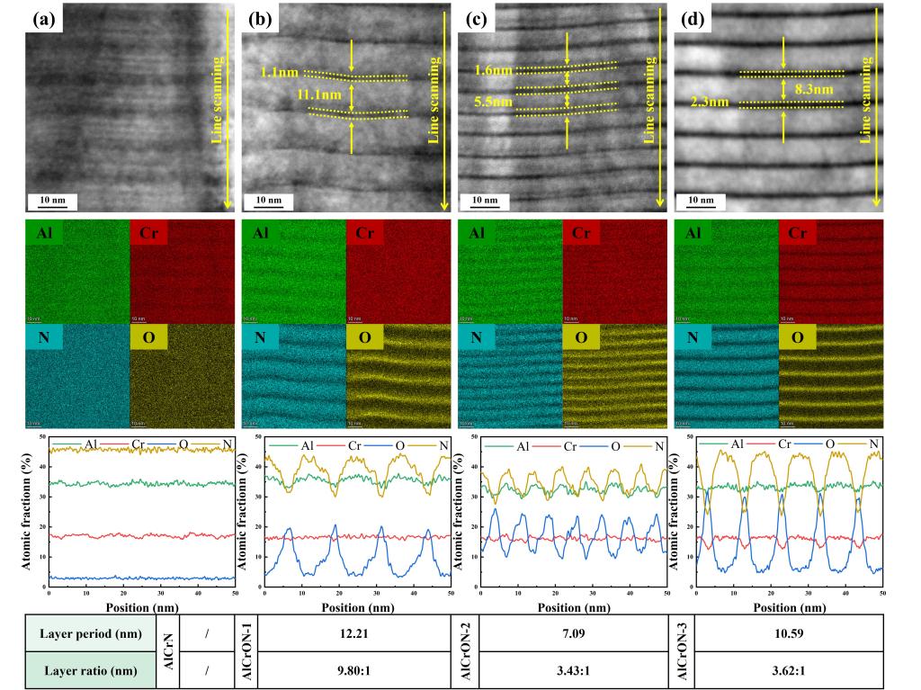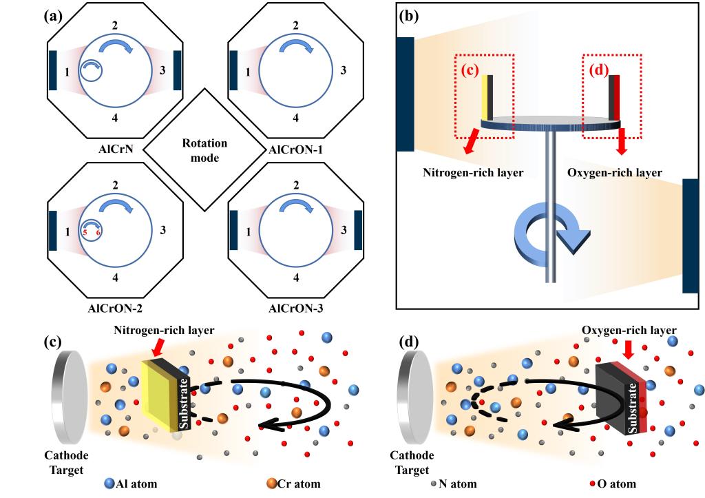 研究团队利用电弧离子镀技术制备了具有富氮和富氧交替亚层的自组织纳米多层AlCrON涂层,通过改变基底旋转方式来调节控其调制结构。研究结果表明二维旋转沉积的AlCrON涂层具有最小的调制周期7.1 nm和最高的涂层硬度30.2±1.9 GPa,在电化学、酸性盐雾腐蚀和摩擦腐蚀条件下表现出优异的防护效果。氧的掺杂有效抑制了电偶腐蚀,纳米多层界面阻挡了腐蚀介质的侵入,因此,涂层自腐蚀电流密度显著降低,降幅接近一个数量级,并将酸性盐雾环境下的失效时间延长至180小时以上。此外,在磨损-腐蚀耦合工况下,该涂层依然表现出优异的摩擦腐蚀性能。这一研究成果对提升海洋强腐蚀环境下关键合金部件的表面耐腐蚀防护性能、延长其使用寿命具有重要意义。(撰稿:张腾飞 审核:汪盛颜 张世宏)