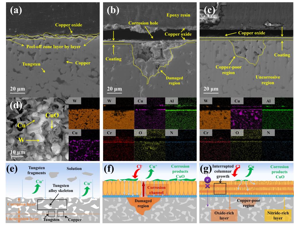 钨铜合金因其具有优异的机械加工性能、高硬度、高耐磨性以及较高的软化温度等特性,广泛应用于航空航天、军工装备领域中的关键合金高温构件,如导弹、火箭的喷管、喉衬和燃气舵等。然而,在中性或酸性腐蚀环境中,特别是在海洋环境中,其较差的耐蚀性能限制了钨铜合金部件的使用寿命和应用推广。表面防护涂层对于钨铜合金在海洋应用中防止腐蚀失效至关重要。