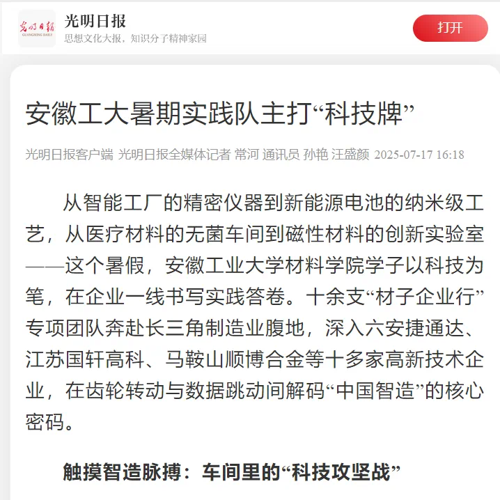从智能工厂的精密仪器到新能源电池的纳米级工艺,从医疗材料的无菌车间到磁性材料的创新实验室——这个暑假,m88官方网站登录地址​m88官网学子以科技为笔,在企业一线书写实践答卷。十余支“材子企业行”专项团队奔赴长三角制造业腹地,深入六安捷通达、江苏国轩高科、马鞍山顺博合金等十多家高新技术企业,在齿轮转动与数据跳动间解码“中国智造”的核心密码。
