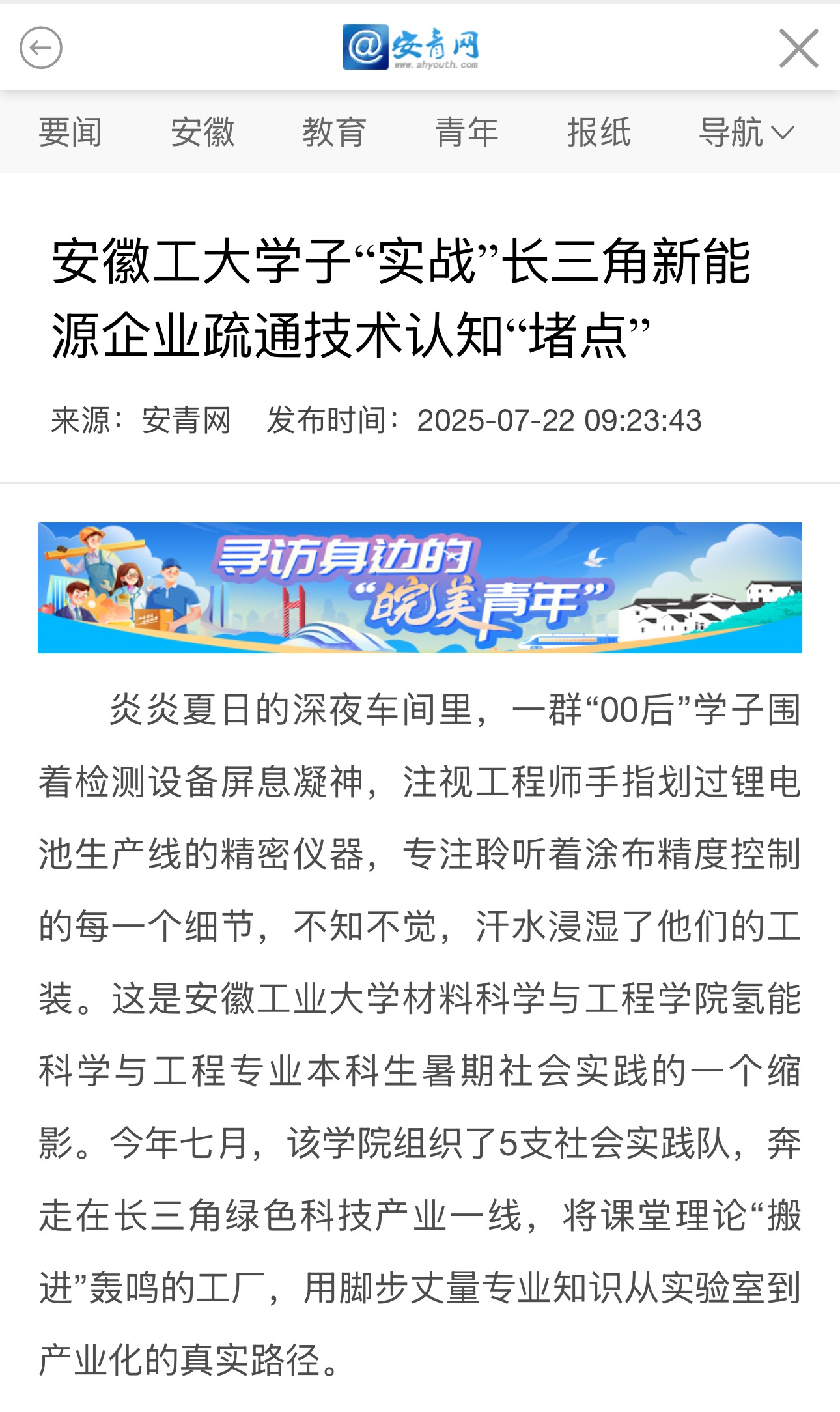 炎炎夏日的深夜车间里,一群“00后”学子围着检测设备屏息凝神,注视工程师手指划过锂电池生产线的精密仪器,专注聆听着涂布精度控制的每一个细节,不知不觉,汗水浸湿了他们的工装。这是m88官网氢能科学与工程专业本科生暑期社会实践的一个缩影。今年七月,该公司组织了5支社会实践队,奔走在长三角绿色科技产业一线,将课堂理论“搬进”轰鸣的工厂,用脚步丈量专业知识从实验室到产业化的真实路径。