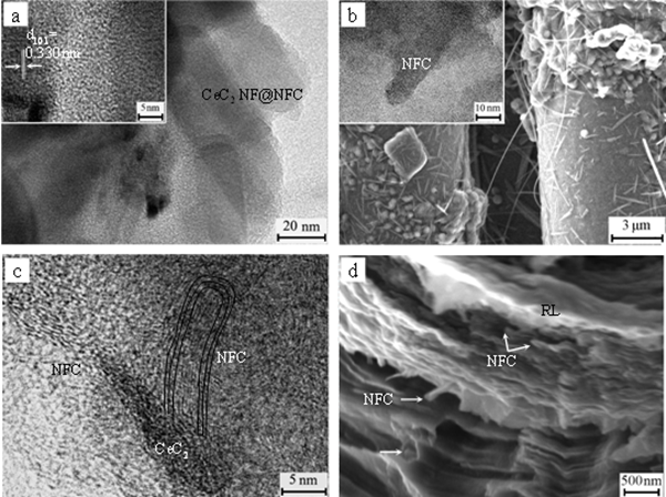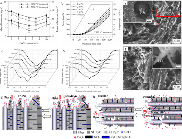 基于稀土铈独特的物理化学性质及其碳化物和氧化物的高熔点,团队将稀土铈均匀分散至碳纤维表面,利用化学气相渗透法制备了纳米丝状碳(NFC)和CeC2纳米线@NFC核壳结构网络增强的C/C复合材料,在提升力学与3000℃烧蚀性能的同时,研究了NFC和CeC2纳米线@NFC的原位生长机制、碳基体结构的演变规律,分析了力学性能提升的原因,从热力学角度计算并探讨CeC2和碳的热化学氧化过程,阐明了纳米线增强网络在改善C/C复合材料高温烧蚀中的作用。该研究工作可为C/C复合材料高强度与抗烧蚀的微观结构设计提供支撑,也对稀土元素向高性能碳材料的扩展应用具有重要意义。