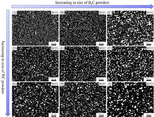 图2 B4C‒TiB2复相陶瓷的显微结构随原料粉体粒径的演变规律
