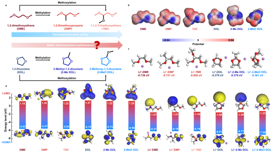 弱溶剂化电解液能通过降低溶剂的溶剂化能力而展现出的优异循环稳定性,近年来受到广泛关注。然而,溶剂化效应与电池性能之间的内在关联尚未被充分理解。溶剂化效应越弱,是否意味着锂金属电池电解质的性能越好?为解决这一问题,团队以1,2-二甲氧基乙烷(DME)和1,3-二氧戊环(DOL)为分子骨架,设计了一系列具有不同溶剂化能力的溶剂,并系统研究了其物理化学性质与电化学性能。研究结果表明,弱溶剂化电解液的性能不仅受溶剂化结构的影响,还受到溶剂本身反应活性的调控。基于这一规律,团队进一步开发出一种基于2-甲氧基-1,3-二氧戊环(2-MeO DOL)的新型弱溶剂化电解液,其兼具弱溶剂化能力和较低的化学反应活性。该电解液在Li-Cu半电池中实现了超过250次的稳定循环,平均库仑效率高达99.3%;同时,在高电压(4.4 V截止)下的Li-NCM811全电池中也表现出优异的循环稳定性。该研究不仅揭示了溶剂化效应与电解液性能之间的内在关系,也为下一代高性能锂电池电解液的分子设计和高通量筛选提供了理论基础和实践指导。相关成果发表在化学领域顶级期刊《Chemical Science》(中科院一区TOP,自然指数期刊,IF为7.6)。公司为论文第一单位,硕士生李亮为第一作者,姜智鹏副教授和李永涛教授为共同通讯作者。