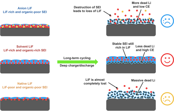 (三种含LiF界面对锂电池长循环的作用效果示意图)