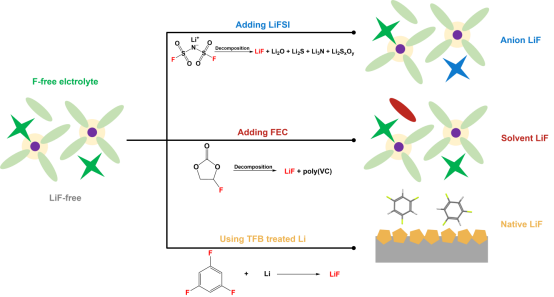 (在无氟体系中引入不同氟源得到三种含LiF界面的示意图)