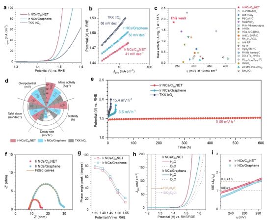 在电催化析氧反应(OER)中,含氧中间体(*OH、*O和*OOH)之间存在吸附能的线性标度关系,这一结构–性能耦合规律严重制约了催化剂活性的理论上限。团队提出了一种通过二维富勒烯网络(C60NET)的电子缓冲效应打破该标度关系的新策略。在构建的Ir纳米簇/C60NET(Ir NCs/C60NET)催化剂中,C60NET能够根据反应中间体的变化动态调控Ir活性位点的电子结构,从而调节*OH、*O和*OOH的吸附强度,打破它们之间的线性关系。这种电子缓冲作用显著提升了催化剂的本征活性和稳定性,使其在酸性电解液中展现出优异的OER性能,表现为低至237 mV的过电位和超过600小时的稳定运行寿命。对比实验和理论计算进一步揭示,C60NET通过可逆电子转移调控Ir氧化态演变,减缓Ir的过度氧化,有效提升了催化剂的结构稳定性和利用效率。本工作为针对单一活性位点打破标度关系以及高性能OER电催化剂的设计提供了新的思路。