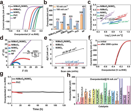 研究团队采用简单的一步水热法,在泡沫镍基底上构筑了具有杨梅状形貌的NiMoO4/NiWO4异质结构催化剂,在碱性电解液中表现出卓越的双功能催化活性和稳定性。异质界面的形成可调控材料的电子结构,促进电荷转移,从而显著增强催化活性。在1 M KOH溶液中,该催化剂在HER反应中仅需17 mV过电位即可达到10 mA cm−2电流密度,优于商用Pt/C催化剂 (33 mV);在OER反应中于10 mA cm−2下的过电位为240 mV,优于RuO2 (294 mV)。此外,基于该催化剂组装的整体水分解系统仅需1.51 V电压即可达到10 mA cm−2电流密度,并具有超过100小时的持续运行稳定性。密度泛函理论 (DFT) 计算表明,NiMoO4/NiWO4异质结构在费米能级附近具有更高的电子态密度,优化了H原子在Ni活性位点上的吸附/脱附能,使ΔGH*值接近于零 (–0.026 eV)。