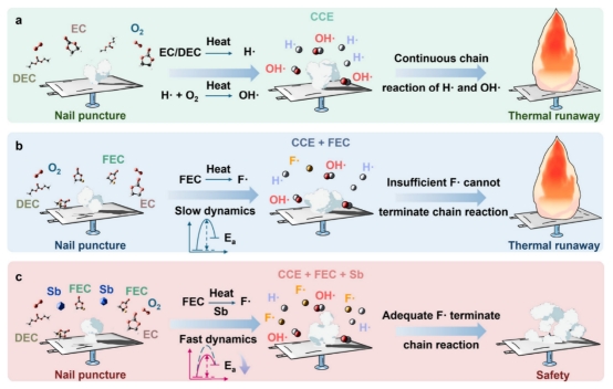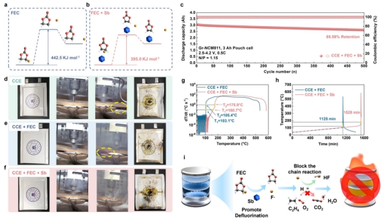 有机电解液的易燃性是锂离子电池安全性的关键挑战之一,传统提高电解液安全性的策略通常依赖大量含氟阻燃剂,但这会牺牲离子电导率并引发环境问题。基于这种思考,团队开发了一种液体有机锑化合物——三乙醇锑(Sb(OEt)₃),作为电解液的阻燃增效剂,仅添加0.5 vol%的Sb(OEt)₃与5 vol%的氟代碳酸乙烯酯(FEC)搭配,即可显著提升电解液的阻燃性,并改善其电化学性能。机理研究表明,Sb(OEt)₃在热分解过程中能生成Sb₂O₃,该产物可催化FEC的脱氟反应,降低氟自由基(F·)的生成能垒,从而中断燃烧链反应,抑制火焰传播。此外,Sb(OEt)₃的引入还改善了Li–石墨(Gr)和Li–NCM811半电池的循环稳定性与倍率性能。基于该电解液组装的3 Ah Gr–NCM811软包电池在500次循环后容量保持率高达85.6%,针刺与加速量热测试进一步验证了Sb(OEt)₃的阻燃协同效应。该研究为新型阻燃机制的探索及高安全锂电池的开发提供了重要思路。