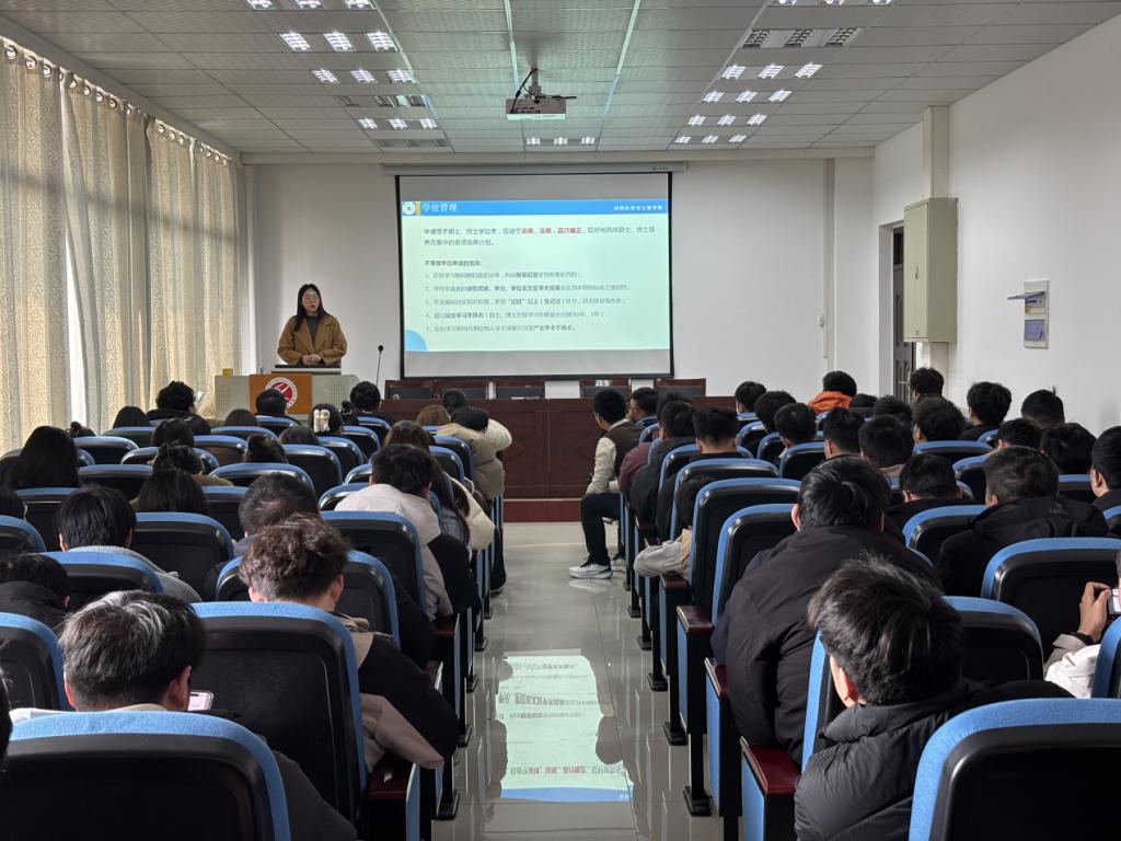 辅导员李盼针对研究生日常学习与管理关键环节,进行了说明。提醒同学们严格遵守校规校纪,及时办理请销假、校外租房、实习、联合培养等手续。她还重点解读了硕士、博士学位申请的基本条件,期望同学们合理规划学业与科研进程,确保按时完成学业。